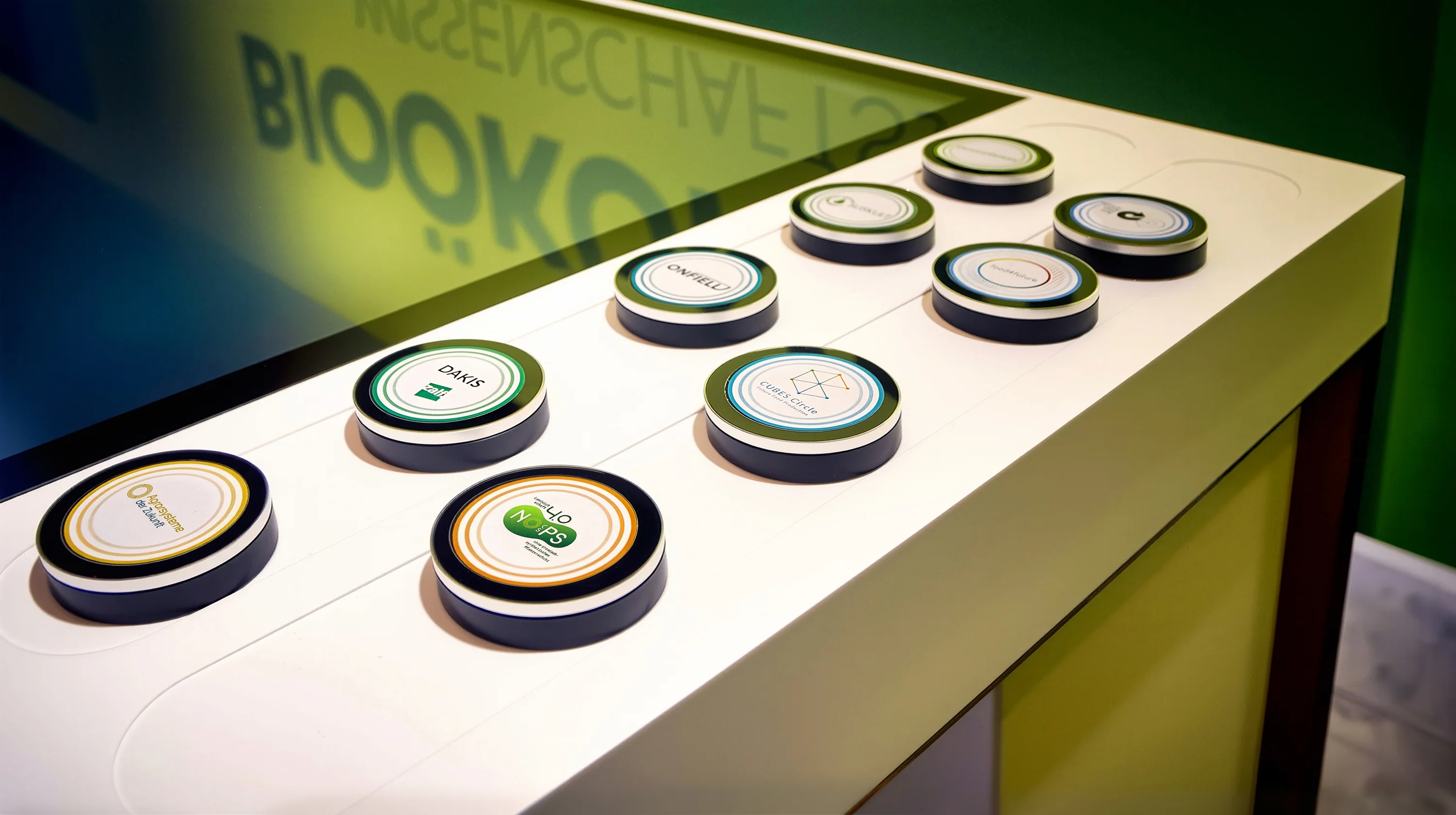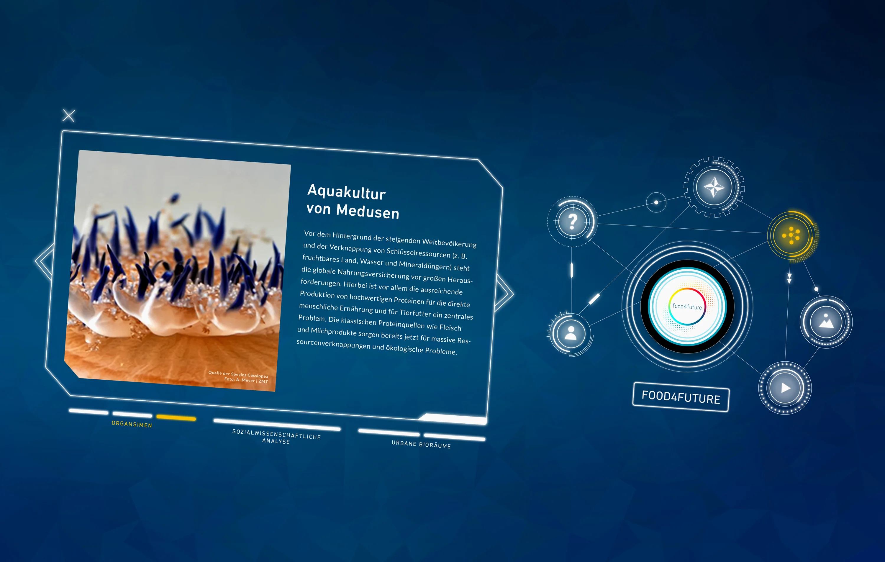 Die „Grüne Woche“ ist eine internationale Messe in Berlin, auf der Unternehmen der Agrar- und Ernährungswirtschaft ihre Produkte präsentieren. Diese Applikation mit Objekterkennung veranschaulicht innovative Ansätze zukunftsorientierter Agrarsysteme des Leibniz Intstitut. Elemente klassischer Science-Fiction-Filme wie „Minority Report“ inspirierten die Gestaltung. Alle Menü-Elemente sind animiert. Inhalte können über unterschiedliche Module per CMS einpflegt werden.
