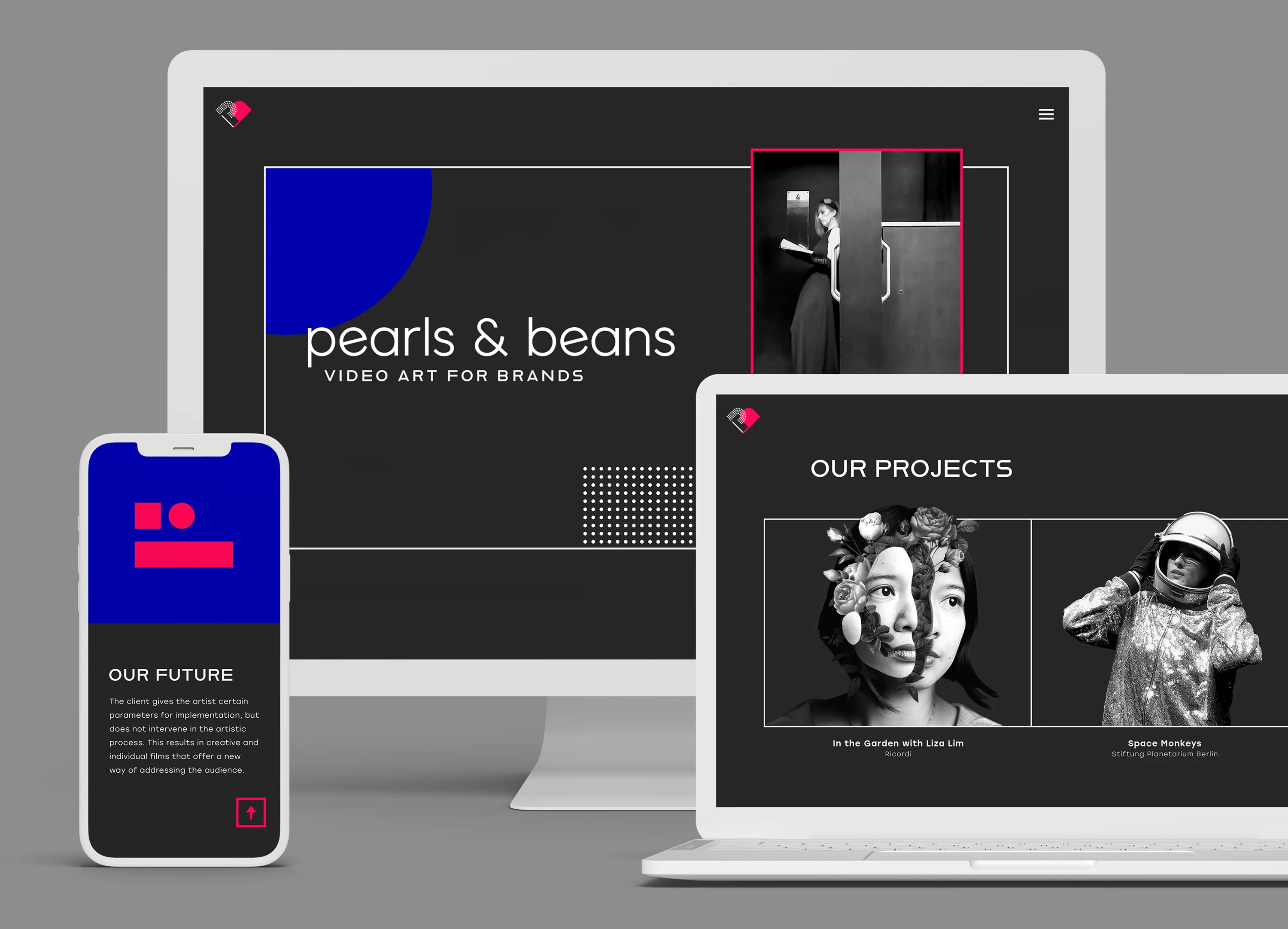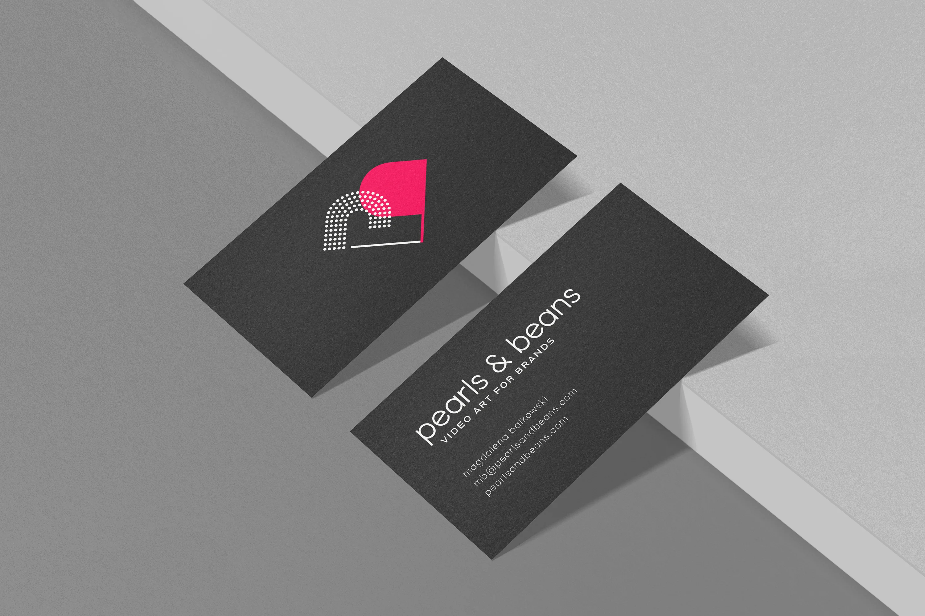 Das neue Unternehmen bietet Videokunst für Firmen an. Der Name prägt die Corporate Identity. „Pearls“ steht für Präzision und Subtilität, während „Beans“ den Kontrast dazu bildet – mutig und laut. Stilisierte Fotografien sowie eine Bauhaus Schrift bilden die Basis der Gestaltung. Das Logo setzt sich aus den Anfangsbuchstaben „p“ und „b“ zusammen. Durch eine Drehung der Buchstaben entsteht ein Herz als Symbol für die Leidenschaft.